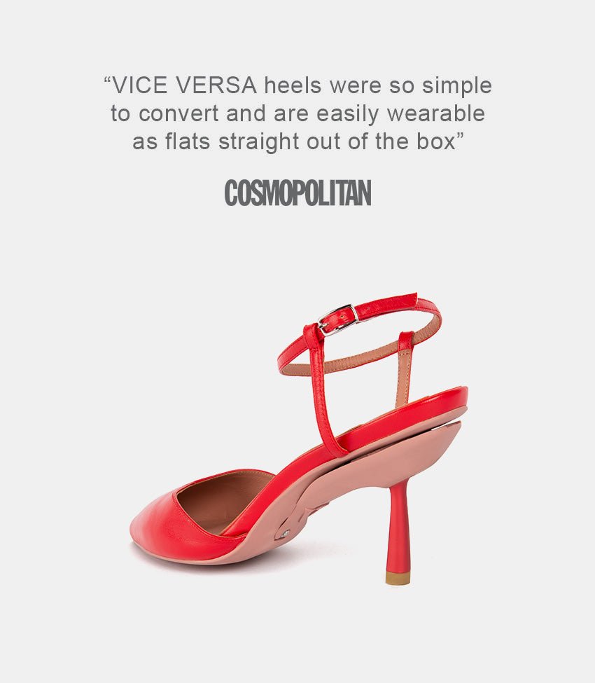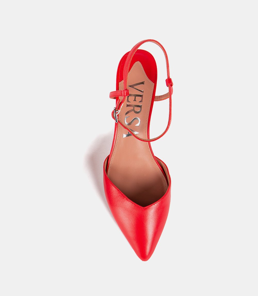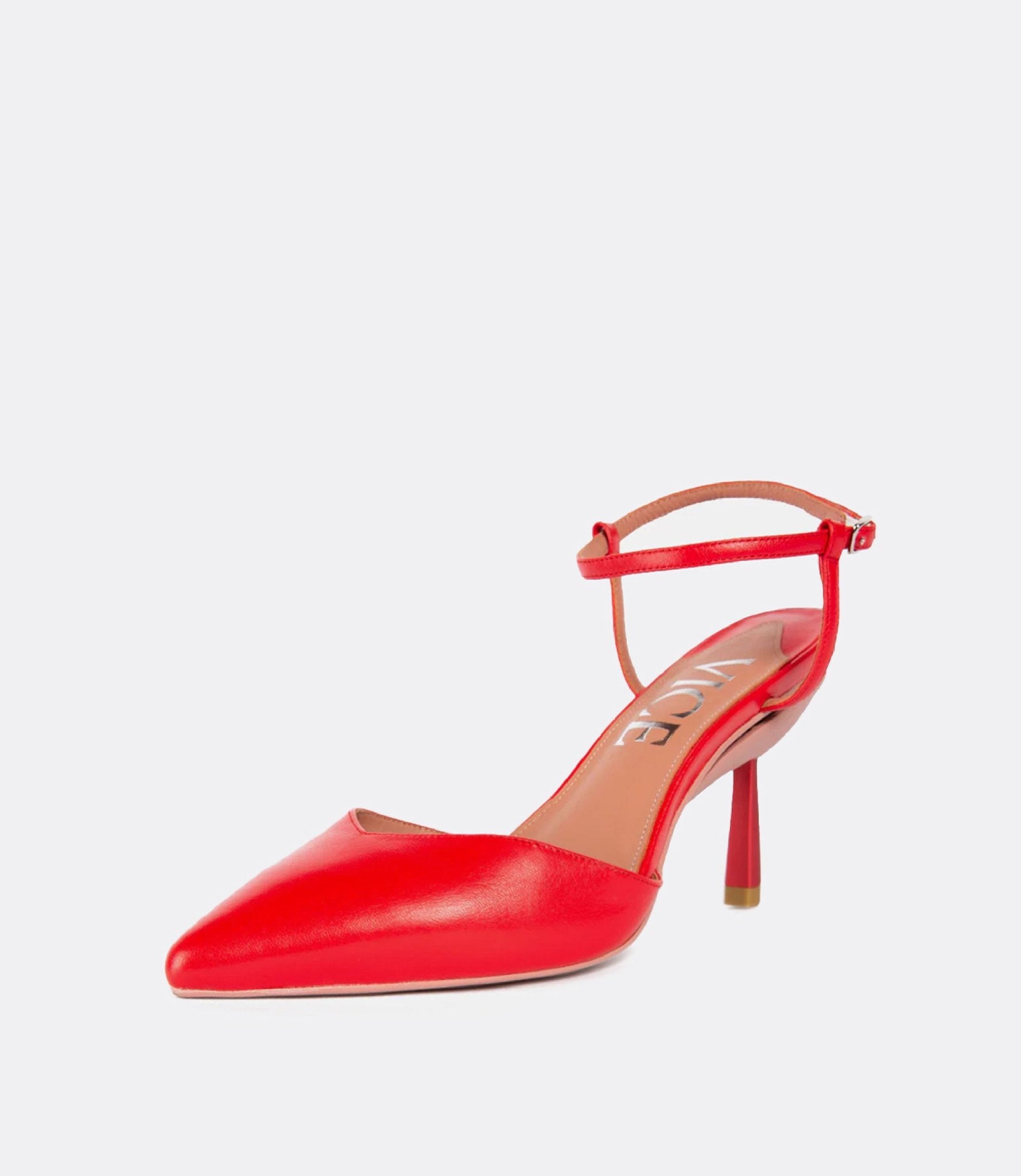 Gösterişli bir kırmızı deri ayakkabı, VICE VERSA dokunuşuyla tasarlanmış. Bu zarif, sivri burunlu topuklu model, asılı bilek kayışı ve iç kısmındaki yastıklamalarla dikkat çekiyor. Deriden el işçiliğiyle üretilen bu topuklu, mükemmel bir günlük ayakkabıdır.
